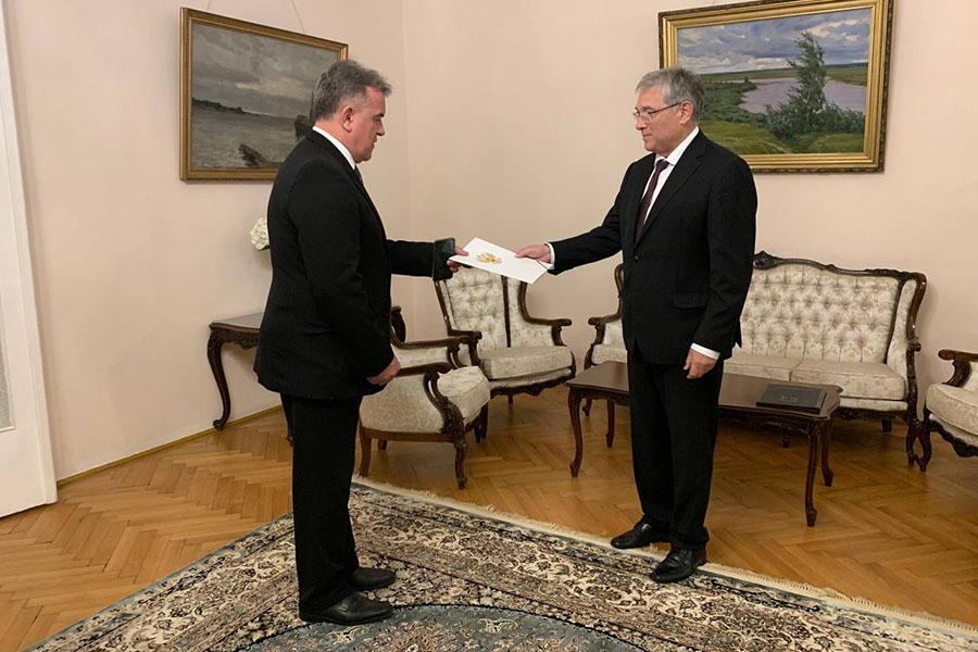 2025/09/103 сентября Посол России в Венгрии Е.А.Станиславов вручил консульский патент гражданину Венгрии Ференцу Леберу, назначенному почетным консулом России в городе Пакш с определением ему в качестве консульского округа области Толна.
