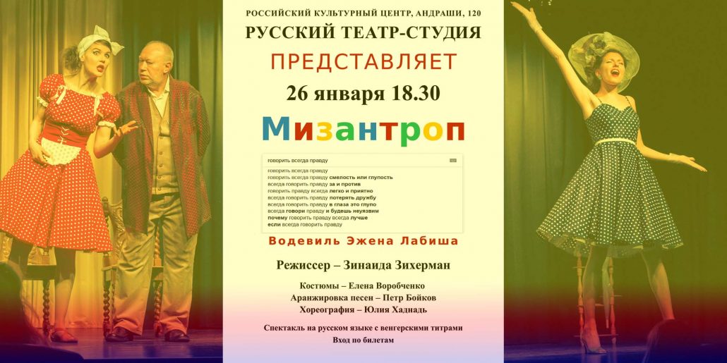 26-го января 2019 в 18.30 Русский театр-студия г. Будапешт покажет водевиль «Мизантроп». Комедийная правда, беззастенчивая ложь и много изящных диалогов с французским шармом! Спектакль с […]
